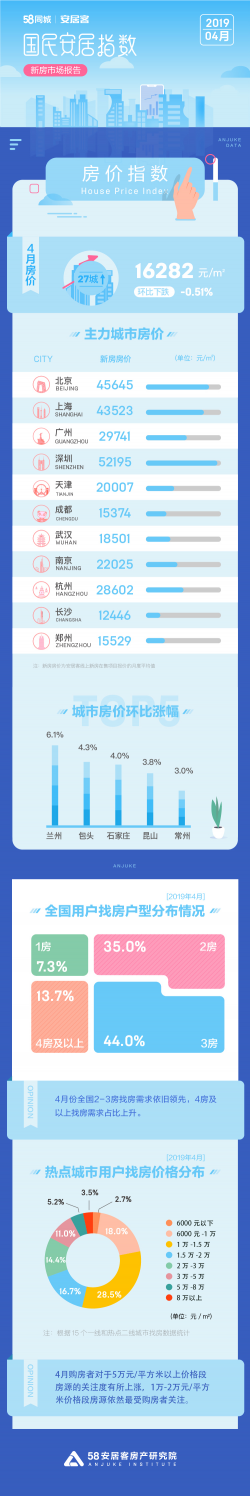 新京報訊(記者 張曉蘭)4月30日,58同城、安居客發布《2019年4月國民安居指數》。報告顯示,北上廣深的房價保持穩定態勢;而南京、杭州等城市房價也正在向一線城市靠齊。在人才政策的推動下,二線城市的熱度也開始提升。 58安居客房產研究院首席分析師張波指出,4月份的市場總體呈現熱度持續上升態勢。一線城市二手房市場保持回暖,二線城市土地市場開始升溫,土地溢價率也有抬升苗頭,各地人才政...... [閱讀更多]