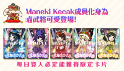 臺灣光榮特庫摩宣布,好評發布中的《信喵之野望 喵APP》,於本日2018 年9 月10日(一)開始與日本超萌女子團體「Maneki Kecak」展開合作活動。只要在本活動限定期間內登入遊戲,就可以獲得「Maneki Kecak」成員的喵武將圖樣特製限定卡。 為紀念本次合作活動,新收錄以「M...... [閱讀更多]
