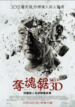 國內的海報 國外的海報 各有不同的感覺 這是奪魂鋸最後一集 又衝著是3D的版本 因而第一回踏進戲院看奪魂鋸 想說要嚇就一次嚇個夠吧 戲情大綱在描述 一名假冒通過拼圖殺人魔遊戲的倖存者"巴比" 因這個謊言而出書享盡名利 因此最終真的被抓去...... [閱讀更多]