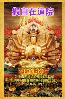 【記者 張秀娟 台中報導】 籌畫許久的觀自在道院,在創辦人董帝君的堅持與努力下,終於大致底定,神尊安置妥當,道院初具成型,成為眾生安生立命的新聖地,董帝君回顧道院創辦的過程,感慨萬千,篳路藍縷的歲月,如今終於有了回報。 觀自在道院數位財神。(圖/觀自在道院提供) 觀自在道院創辦人董帝君,祖籍浙江舟山普陀山,自出生以來,深受父親董阿康影響極大,除致敬供奉觀世音菩薩外、每...... [閱讀更多]