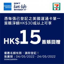 7-Eleven x美國運通 購物可享高達HK$60簽賬回贈