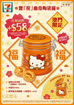 限量換購 由2月8日早上7時起 任何消費加$58 即可換購1件 澳門 - Media OutReach - 2021 年 2 月 5 日 - 7-Eleven特別推出澳門限定的豐「祝」曲奇陶瓷罐,以人氣Hello Kitty為款式,罐身顏色採用溫暖又活潑的橙色,蓋上印有「豐祝」祝賀詞,而且內附10塊腰果酥,寓意讓你新一年豐足常滿!用來送禮或自用都十分合適,澳...... [閱讀更多]