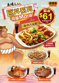 香港2024年8月5日 /美通社/ -- 吉野家全新餐牌隆重登場!由即日起吉野家將推出全新「巨丼系列」,除了將經典和風牛肉丼升級成更豪華的巨丼外,更推出了牛肉煎雞雙拼丼、日式咖喱 Double 雞扒巨丼以及黑椒西冷牛扒巨丼,讓大家食得更多肉又滿足,價格更低至$61起。無論你是相撲手般食量或是食肉獸,都絕對能滿足你的原始「肉望」! 吉野家全新「巨丼系列」...... [閱讀更多]