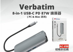 【折扣碼】減 $100 限量購 Verbatim 8-in-1 USB-C PD 87W 擴展器 | 香港 |