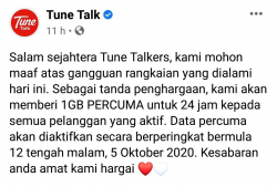 就在昨天下午,Celcom的網路服務一度面臨癱瘓,身為與Celcom公用網路的Tune Talk也因此面臨了網路癱瘓的問題,導致用戶無法撥電及上網。不過服務也在昨天傍晚6時左右獲得解決,為了做出補償, Tune Talk 在今天為用戶提供免費1GB Data上網。 據Tune Talk臉書文告表示,Tune Talk為這起事件向...... [閱讀更多]