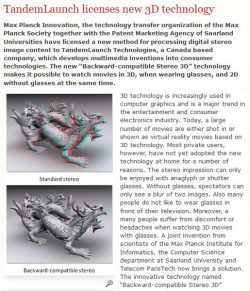 隨著3D立體電影的普及,越來越多聲音是來自2D族群,他們希望看到一般的2D版本影片,但偏偏戲院只有3D版本時候,只能帶著2D還原的眼鏡,十分的擾人。不過現在有個新的技術可能可以改變這個現象! 這一家加拿大公司TandemLaunch Technologies研發了一種新的技術"Backward-compatible Stereo 3D",這個技術的最大優點,就是戴上眼鏡的人可以體驗到...... [閱讀更多]