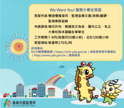【今傳媒/記者李祖東報導】配合教育部青年署持續推動之大專生公部門見習計畫,高雄市區監理所提供大專青年朋友暑假期間(7–8月)工讀機會,兩個月的見習期間,透過實務參與,可以了解監理所運作及業務內容,確定自己未來努力的方向,向夢想的職涯生活邁進。 招募對象為年齡35歲以下,精通英文為佳,國內公立、教育部立案之私立大專校院(含軍警學校學生及空中大學全修生,不含五專專一至專三生...... [閱讀更多]