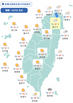 台北二二八公園 中央氣象局表示,今(2)日受大陸冷氣團影響,北部及東北部整天感受偏冷,其他地區早晚亦偏冷,清晨各地低溫約13至15度,本島最低溫在南投中寮9.8度,北部及宜蘭白天高溫約18、19度,中南部約24至26度,日夜溫差仍大,早出晚歸請適時增減衣物;迎風面水氣增多,桃園以北及東半部地區有局部短暫雨,其他地區維持多雲到晴。 氣象局說,東北風增強,上午...... [閱讀更多]
