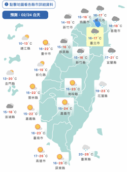 台北二二八公園 中央氣象局表示,今(24)日強烈大陸冷氣團南下,北部及東北部天氣轉冷,上半天高溫仍有16到20度,下午開始氣溫將明顯下降,到了晚上就會降到12到14度,其他地方還不受影響,白天高溫台中到台南、花蓮約22到24度,其他地方可以來到26到28度,局部地區會再更高一些,但是入夜後也會降到13到17度,提醒民眾留意溫度的變化。 天氣方面,迎風面降雨...... [閱讀更多]