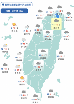 記者黃宣瑄/綜合報導 中央氣象局表示,今(14)日強冷空氣影響,氣溫偏低,北臺灣高溫只有15、16度,臺中到臺南、花東地區高溫19~23度,高屏地區稍微溫暖一些,高溫仍有25~27度,而入夜後中部以北及宜蘭低溫11~13度,南部及花東低溫14~16度,特別提醒,北部局部地區有10度以下氣溫發生的機率,請大家留意氣溫變化,務必做好保暖工作;天氣方面,隨著華南雲雨區東移,各地雲量增加,...... [閱讀更多]