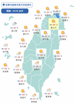 記者黃宣瑄/綜合報導 中央氣象局表示,今(12)日環境吹東到東南風,氣溫回升,不過早晚仍稍涼,各地低溫約17~19度,白天高溫普遍可以來到25~28度,近山區或河谷會更高一些,中午前後感受較為舒適溫暖,日夜溫差稍大,請留意溫度的變化;天氣方面,明日西半部雲量減少,見到陽光的機率會比今天高上許多,花東地區仍需留意局部短暫陣雨,宜蘭與北部山區則注意偶有零星飄雨。 ▲圖/中央氣...... [閱讀更多]