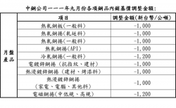 中鋼公司 111 年九月份月盤產品基價平均調降3.32%