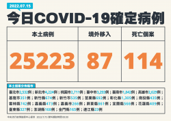 中央流行疫情指揮中心今(15)日公布國內新增25,310例COVID-19確定病例,分別為25,223例本土個案及87例境外移入;另確診個案中新增114例死亡。 指揮中心表示,今日新增之25,223例本土病例,為11,416例男性、13,786例女性、21例調查中,年齡介於未滿5歲至90多歲以上。 個案縣市分佈 新北市4,224例 臺中市3,293例 桃...... [閱讀更多]