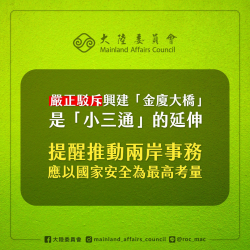(圖/大陸委員會Facebook) 現任台灣民眾黨黨主席、台北市長柯文哲日前拋出在金門與中國廈門間,應興建「金廈大橋」,引起各方熱議。柯文哲更稱是現行「小三通」政策是當今總統蔡英文當陸委會主委時做的,金廈大橋只是讓小三通運作更有效率而已。對此,陸委會今(21)日不僅表示,推動兩岸事務應以國安為最高考量,更提出4點嚴正駁斥柯文哲的無知主張和荒謬比擬,以正社會視聽...... [閱讀更多]