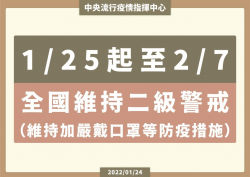 因應國際疫情嚴峻,且國內發生新變異株Omicron感染事件,中央流行疫情指揮中心經與相關單位溝通及評估後於24日宣布,1月25日至2月7日維持疫情警戒標準為第二級,調整或維持相關措施及規定如下: 1/25至2/7全國維持二級警戒。圖:指揮中心提供 一、維持加嚴之戴口罩規定,除少數例外情形,外出全程佩戴口罩: 請繼續往下閱讀....... [閱讀更多]