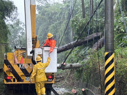 圖/台南市龍崎區大樹壓斷高壓線,同仁進行樹木砍伐及停電事故處理中 【今傳媒/記者張淑慧 報導】台南市今(25)日統計至中午12時,因凱米颱風導致高壓斷線及開關故障,造成目前東山區、玉井區、南化區、楠西區、白河區、關廟區、龍崎區、七股區等一帶共8,493戶停電,累積曾停電戶數達54,439戶。台電正積極搶修中,造成不便敬請見諒。用戶如自家跟鄰近少數幾戶仍然停電,可能是位於...... [閱讀更多]