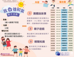 ▲「我家雄和氣」親子活動。 高雄市政府社會局家庭暴力及性侵害防治中心為讓民眾重視目睹家庭暴力對兒少影響深遠,與親子館(原名育兒資源中心)攜手舉辦「我家雄和氣」親子活動,自22日起至10月29日在高雄市18處親子館推出18場親子活動,活動中有促進親子關係與家庭和諧的說故事活動、親子互動遊戲,以及親職知識分享,還有有獎徵答能將好禮帶回家,邀請家長趁著暑假,帶著學齡...... [閱讀更多]
