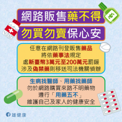 ▲網路販售藥不得。 在嚴重特殊傳染性肺炎(COVID-19)疫情影響下,國人消費型態趨向以網路購物並宅配到府,有些民眾誤以為可以透過網購平台販售藥品,如感冒藥、止痛藥、中藥材、酸痛貼布、消炎乳膏、麻醉藥膏、醫藥級益生菌及高劑量維生素等,殊不知這種網路販售藥品的行為,已經違反藥事法相關規定。 高市衛生局提醒藥品不是一般商品,出國旅遊購買藥品回國,請勿於網路刊...... [閱讀更多]