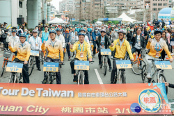 「2023國際自由車環台賽-桃園市站」登場,桃園市長張善政領騎為活動揭開序幕。 「2023國際自由車環台賽-桃園市站」全長約124.71公里,13日上午於市府前廣場出發,計有來自全球31個國家184位菁英選手齊聚挑戰,選手們從市政府廣場出發,沿途行經桃園、蘆竹、大園、觀音、新屋、楊梅、平鎮、大溪、龍潭等行政區,終點復興區角板山。桃園市長張善政率隊領騎為賽事揭開...... [閱讀更多]