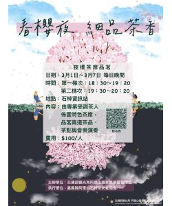 南部最大聲/吳文斌 大阿里山山區從元月起進入櫻花大爆發期,各品種櫻花隨著時序接力綻放,阿里山石棹茶文化協會3月1日起至7日晚上將在石棹櫻之道舉辦春櫻夜-細品茶香活動,在夜琉璃和昭和櫻花步道下,讓遊客體驗茶旅達人精心佈展的特色茶席。夜櫻茶席每天晚上分兩個梯次舉行,採預約制,有興趣的民眾請撥打預約電話0978562577洪先生。 有如置身世外仙境,浪漫爆棚,石棹春櫻夜每年都吸引滿滿...... [閱讀更多]