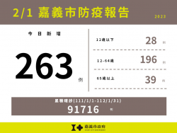 嘉義市2/1新增263例確診/嘉義市府提供 中央流行疫情指揮中心今(2/1)日公布嘉義市新增263例確診個案,包含12歲以下28例,12到64歲196例,65歲以上39例。111/1/1截至112/1/31嘉義市累計確診嚴重特殊傳染性肺炎本土病例數為91716人。 嘉義市政府衛生局提醒,請大家儘速接種疫苗,並持續落實勤洗手、咳嗽禮節及佩戴口罩等防疫措施,避...... [閱讀更多]