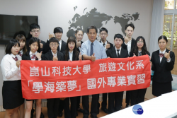 崑山科大20名學生暑期赴日實習。 獲得教育部學海築夢計畫補助,崑山科技大學旅遊文化系遴選20名學生,將於暑假期間,前往日本大分縣別府市新鶴田飯店、鬼山飯店、兩築別邸、杜之湯渡假飯店、九重町九醉溪溫泉、湯布院等10家溫泉飯店進行暑期實習及學年實習。旅遊系劉靜慧主任表示,這是該系連續7年選送學生出國實習,培養國際競爭力。 劉靜慧系主任表示,該...... [閱讀更多]