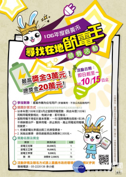 嘉義市政府與中華電信、台電公司合作,攜手共推夏月節電 為鼓勵嘉義市民從日常生活落實省電行為,嘉義市政府今(106)年夏日除了舉辦「尋找在地節電王」活動,更結合中華電信的「智慧節能家電」促銷和台電的「全民節電運動」共同推動夏日節電運動,透過獎勵及節能家電促銷呼籲全民正視全球暖化、響應節能減碳運動,共同讓嘉義市邁向綠能節電,低碳嘉園之目標。 嘉義市...... [閱讀更多]