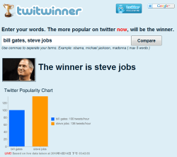 Twitter 除了有微網誌的身份外,對於資訊傳遞而言亦是一個非常重要的角色,許多重要重要事件的訊息都源自於 Twitter ,因此若要知道世界各地在流行什麼,問 Twitter 就對了! Twitwinner 是一款比較 Twitter 關鍵字熱門程度的線上工具,也可以說是關鍵字的 PK工具,輸入要查詢的關鍵字 Twitwinner 就會將您鎖列入比較的關鍵字熱門程度繪製為一...... [閱讀更多]
