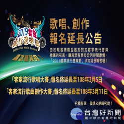 桃園市政府客家事務局主辦「2019客家流行音樂節」之「客家流行歌唱大賽」及「客家流行歌曲創作大賽」報名期間分別延長至3月5日及3月11日;提供參賽者更充分的報名準備時間,讓想參與的民眾都有機會報名喔! 「2019客家流行音樂節」包含「客家流行歌唱大賽」、「客家流行歌曲創作大賽」及「客家歌曲合唱大賽」等3大系列賽事,活動總獎金高達178萬元。為讓愛...... [閱讀更多]