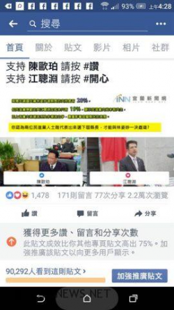 新聞中心/整理報導 宜蘭新聞網4月18日晚間6點30分許,就民進黨有意參選2018年底五合一縣長選舉人選陳歐珀、江聰淵兩人,做網路直播民調顯示,在為期4個小時內,總共有85816人次觸及、流覽人數為21302人次、按讚數為1478、投票數為6502人次,其中陳歐珀得票為3360票(佔51點7%)、江聰淵得票2709票(佔41點2%)、其他票數為433票(佔6點7%),陳歐珀在這次的民調...... [閱讀更多]