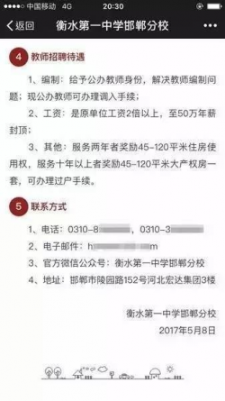 衡水一中邯鄲分校的一則招聘啟事,讓整個教育界都不淡定瞭。 這則招聘啟事的標題是:「來衡水一中邯鄲分校當老師,有身份、年薪高、有房住」。 消息一出,各大媒體相繼報道,中國之聲《新聞晚高峰》直擊重點:「衡水第一中學邯鄲分校以最高年薪50萬元加送住房的待遇面向大陸招聘老師」。 學校在招聘啟事中承諾,應聘成功者除解決教師編製之外,將獲得原工資兩倍以上,最高年薪「50萬元封頂」的待...... [閱讀更多]