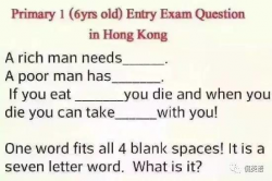 最近,在網路上流行一張香港聖方濟各國小入學試題。 題目是一道英文選擇題,要求是:在下面瞭三句話、四個空裡,填入一個相同的詞,保證每句話的意思都能講通。 相比大陸民辦國小入時考父母、查三代的面試題,這樣的試題簡直就是一股清流,讓人如沐春風啊。 在我公佈答案之前,大家都可以自行想一想下面的三句話,空格裡的星號應該是個什麼單詞? 1. A rich man need...... [閱讀更多]