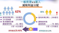 鉅亨網記者陳慧菱 台北 (2017-10-04 11:46:59) 本次稅改一般民眾減稅利益有616億元,減稅幅度有20.46%,至於富人減稅利益為378億元,減稅幅度為10.12%。(圖:財政部提供) 財政部全民稅改預告期到明 (5) 日為止,財政部表示,本次推動的全民稅改方案,共有三大主軸,一是減輕薪資及中低所得者稅負;二是減輕中小企業及新創事業稅負;三是建立具競爭力的投資所得...... [閱讀更多]