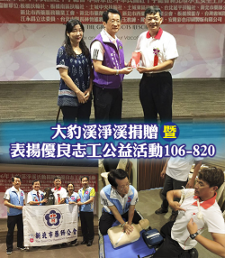 大豹溪淨溪捐贈暨表揚優良志工公益活動106-820 捐款、捐贈救生器材協助紅十字水上救難隊-維護大豹溪救生活動(以前大豹溪一年平均大概有20幾位因戲水死亡,近幾年已經降到一位甚至已沒有),感謝水上救難隊員們的努力及辛勞 *當你遇到有人需要呼吸急救時,第一時間應該先找到AED(自動體外電擊器),記住搶救黃金時間為只有5分鐘、所以盡快去下載AED。App 就可第一時間知道離你...... [閱讀更多]