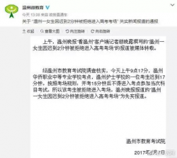 【提醒】考生遲到2分鐘被拒進入大學聯考考場?教育局回應 iiix | 2017-06-09 浙江省溫州市教育局7日在其官方微博發表通報稱,溫州晚報報道的「溫州一女生因遲到2分鐘被拒絕進入大學聯考考場」為失實報道,該考生遲到17分鐘。 通報指出,7日上午,溫州晚報「看溫...... [閱讀更多]