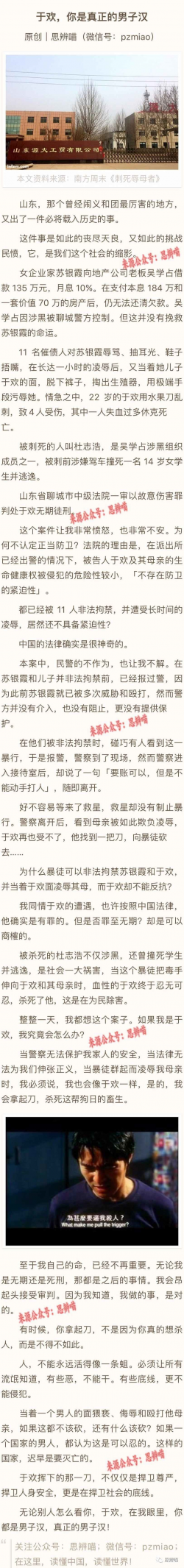 .標題下藍字 洞見時代風雲 小編微信 長按二維碼添加政商君 古代二十四孝圖,有臥冰求魚的熱情,也有埋沒孩子的冷酷,孝子賢孫都上瞭光榮榜。當代孝子於歡,卻帶著莫須無期的罪名來瞭。於歡目睹眾惡y辱其母,出手阻止,刺潰眾惡。有一惡人失血過多而死,於歡被判無期。 壯哉於歡,一個不畏列強的好男兒,一個保傢護母的好孩子!誰都不能否認,一個堂堂正正的孝子...... [閱讀更多]