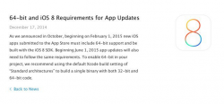 繼先前要求開發者從2015年2月1日起將App加入64位元架構程式碼設計後,蘋果再次提醒開發者必須在2015年6月1日後全面採用64位元架構編碼設計App,在此之後任何以32位元架構編碼提交的App將無法獲得蘋果核准於App Store上架。 雖然64位元架構處理器具備向下相容32位元架構程式碼軟體特性,但基於提供更好的運作效率與記憶體使用率,蘋果在稍早陸續要求開發者在20...... [閱讀更多]