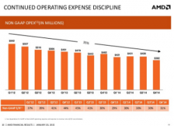 AMD揭曉2014年第四季財報,其中以一般公認會計原則 (GAAP)計算第四季內營收為12.4億美元,而營運虧損為3.3億美元,淨虧損則達3.64億美元。若以全年營運來看,AMD在2014年整體營收增加約2億美元,但營利則從去年1.03億美元轉為1.55億美元虧損,並且形成高達4.03億美元虧損總值。 根據AMD稍早公布2014年第四季財報結果,其中以一般公認會計原則 (G...... [閱讀更多]
