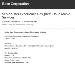 在先前與Beats有諸多市場「較勁」後,Bose近期傳出將推出雲端音樂服務內容,似乎意味將推出如同Beats Music般的串流音樂服務。 根據Bose稍早刊登職缺內容顯示,將聘僱專職雲端音樂服務的資深使用體驗設計人員,並且將與Bose旗下研究及進階發展單位共事,其中也明確表示Bose即將推出旗下音樂串流服務消息。 目前還無法確定Bose準備推出音樂串流服務相關細節,但...... [閱讀更多]