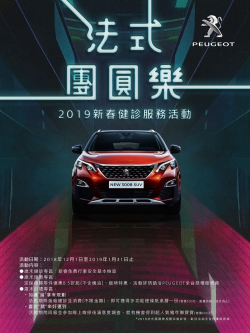 2019 Peugeot法式團圓樂將於2018年12月1日至2019年1月31日為車主們展開全系列關懷活動,除提供車主們免費安心健診外,還有貼心的定保零件優惠及鈑烤特惠,讓愛車亮麗的與您一同迎接新年。活動期間內回廠消費還可獲得車主專屬法式好禮,規劃跨年及出遊計畫前,別忘了先安排回廠團圓拿好禮。 Peugeot法式團圓...... [閱讀更多]