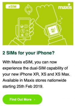 千呼萬喚,Maxis的eSim服務終於要推廣到iPhone上了!根據本地媒體的消息指出,Maxis正在給用戶發email,預告自家的eSim服務即將進一步推廣到iPhone XR、iPhone XS以及iPhone XS Max上。 以上是Maxis發給其用戶的email,裏面指出了Maxis eSIM服務將...... [閱讀更多]