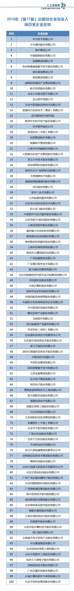 中國工信部公布2018年中國軟體業務收入百強企業:Huawei連續17年獲第一!