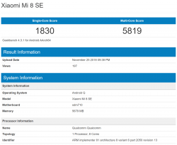 【繼Google之後的Android第一家?】運行Android Q的小米8 SE現身Geekbench跑分網!