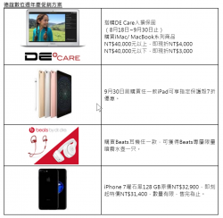 德誼數位 DataExpress 今(23)日宣布週年慶領先開跑;即日起至 2017 年 9 月 30 日止,凡購買 iMac / MacBook 系列商品金額達 40,000 以上,加購 DE Care 人損保固即享現折 4,000 元;購買金額 40,000 元以下,加購 DE Care 人損保固則可現折 3,000 元;極為搶手的 iPhone 7 Plus 曜石黑 128GB,另有...... [閱讀更多]