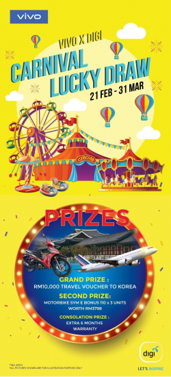 這次由vivo與Digi攜手來給你送禮啦!有獎活動旗艦為2月21日起至3月31日為止,在期間內凡是簽購Digi的配套併購買vivo手機,即可參加vivo與Digi聯辦的嘉年華幸運抽獎活動,你有機會贏取價值RM10,000的韓國旅遊券! 簡單來說,這次抽獎的最大獎就是那個值RM10,000的韓國旅遊券(共一組)...... [閱讀更多]