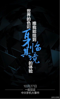 Tuesday, October 25, 2016 11:45 pm, Posted by Eric Wong | 新聞訊息 中興通過官方微博宣佈,在10月27日召開新機發佈會,發佈會主題宣傳為:世界的色彩,唯我能給到身臨其境的體驗,10月27日一起見證中興手機大事件。我們預測屆時發佈會可能會正式發佈旗艦機天機7 Max,此前消息曝光新...... [閱讀更多]